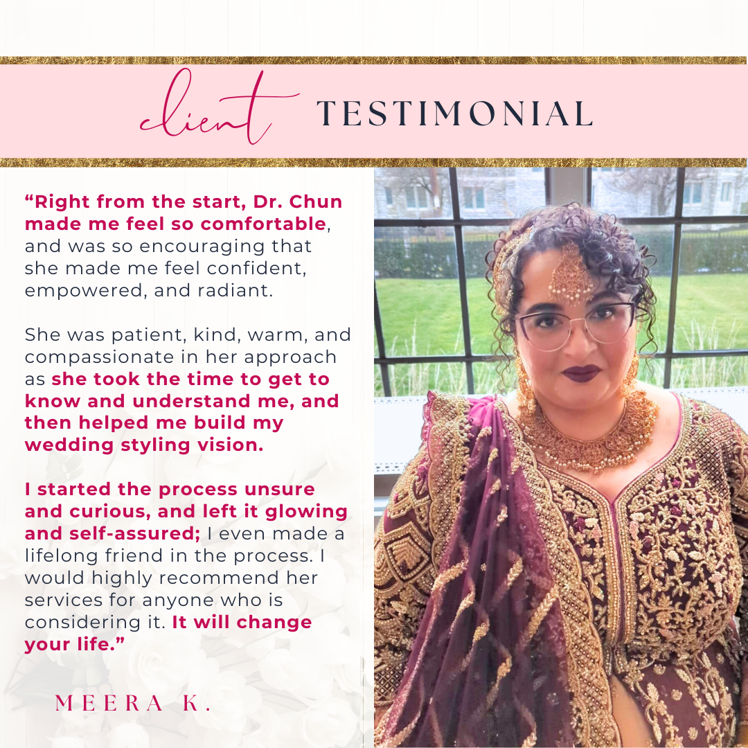 Dr. Charlotte Chun was extremely helpful. She made a direct hit on the advice, with her recommendations lining up extremely well with the direction I was already drawn to and heading for my wedding attire. This brought an extra level of confidence.